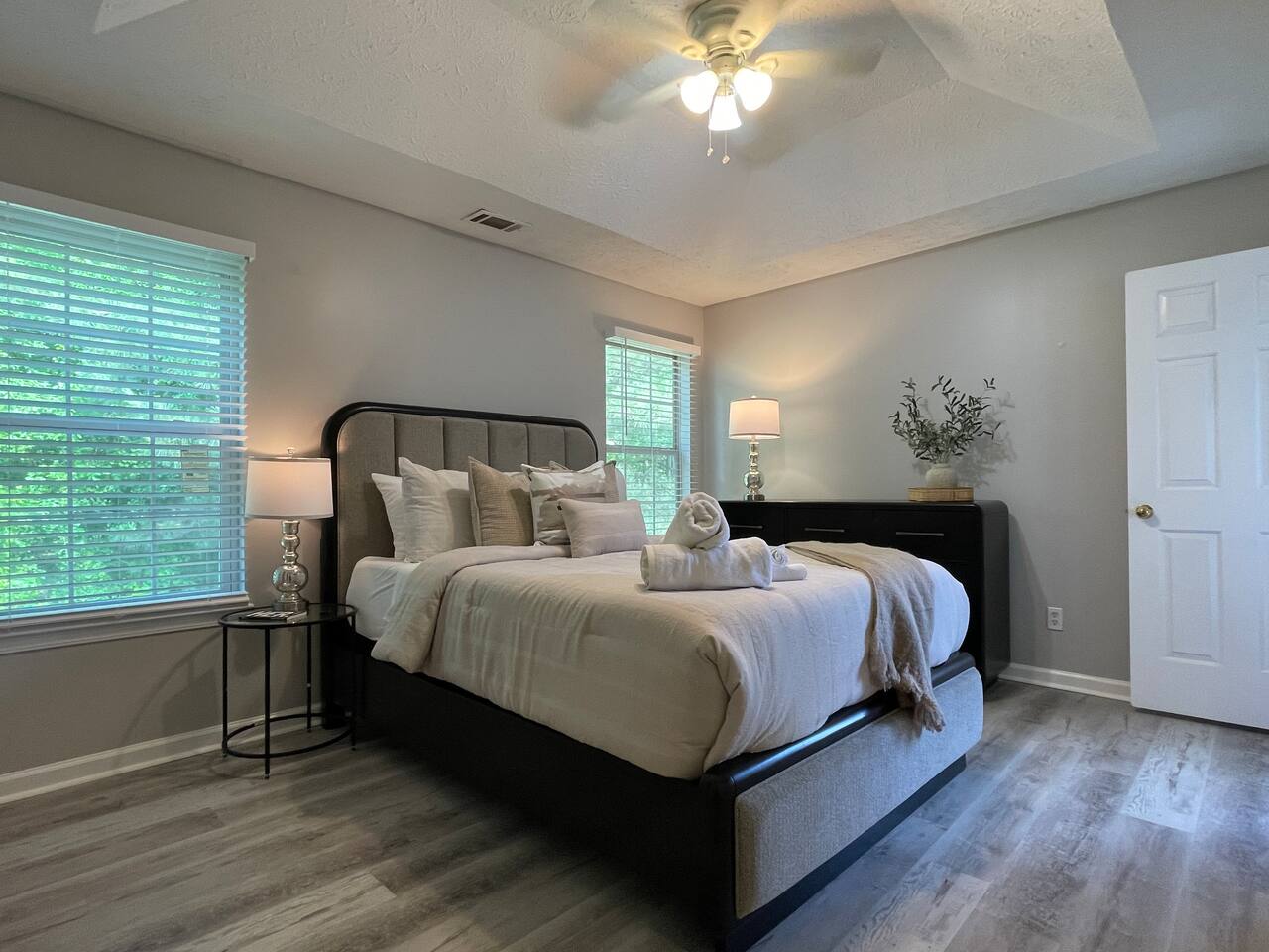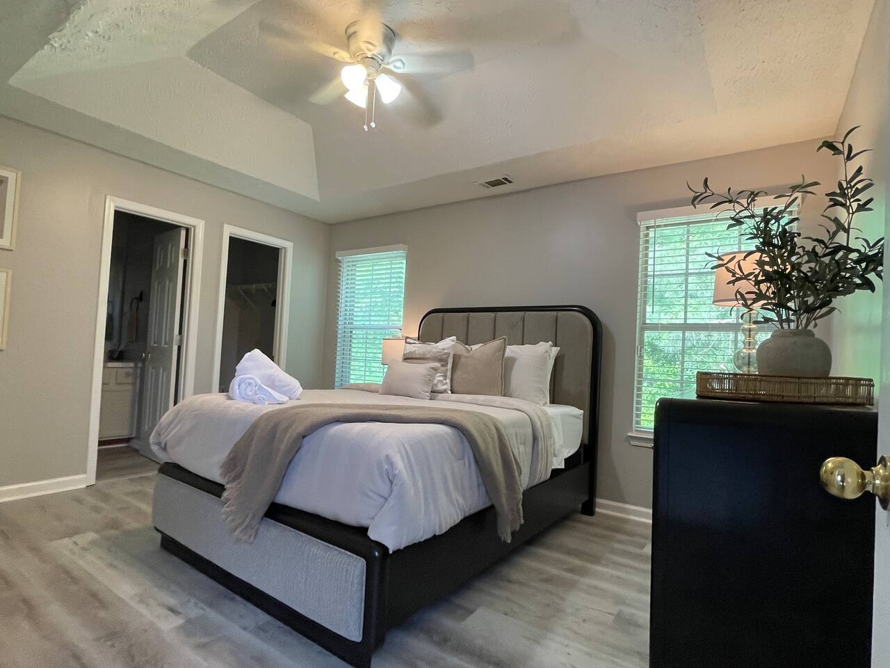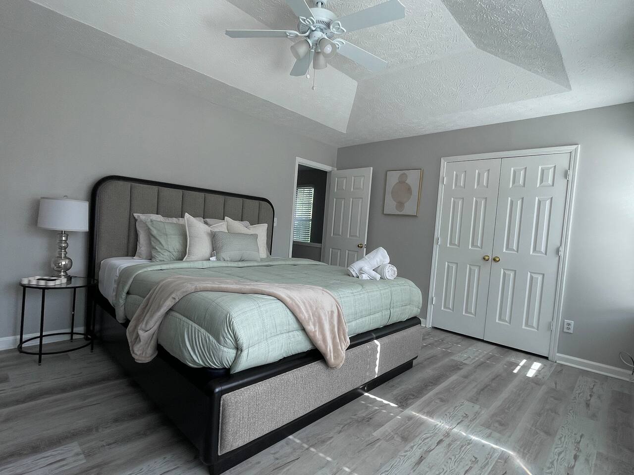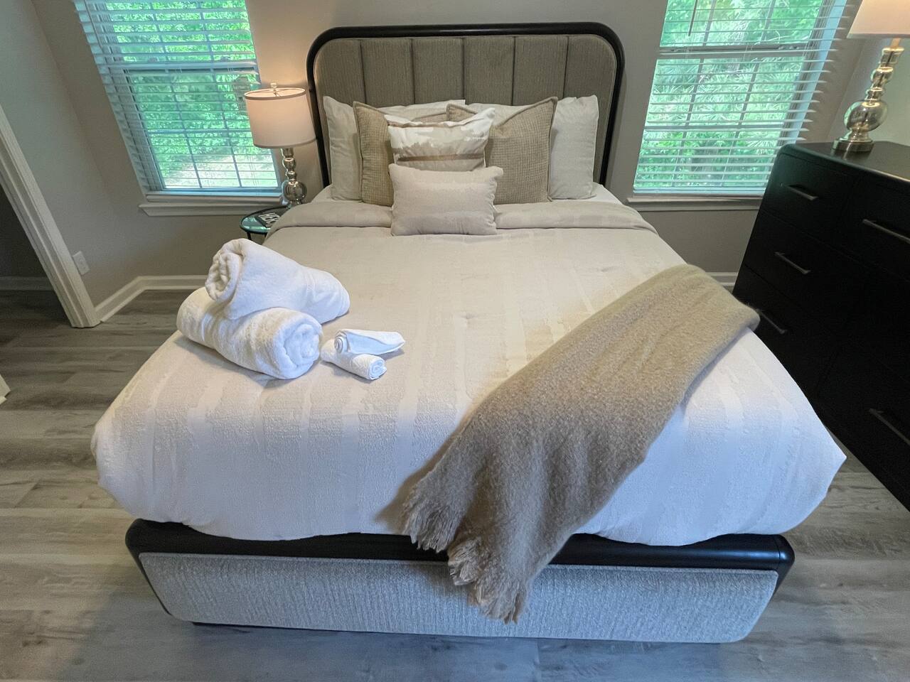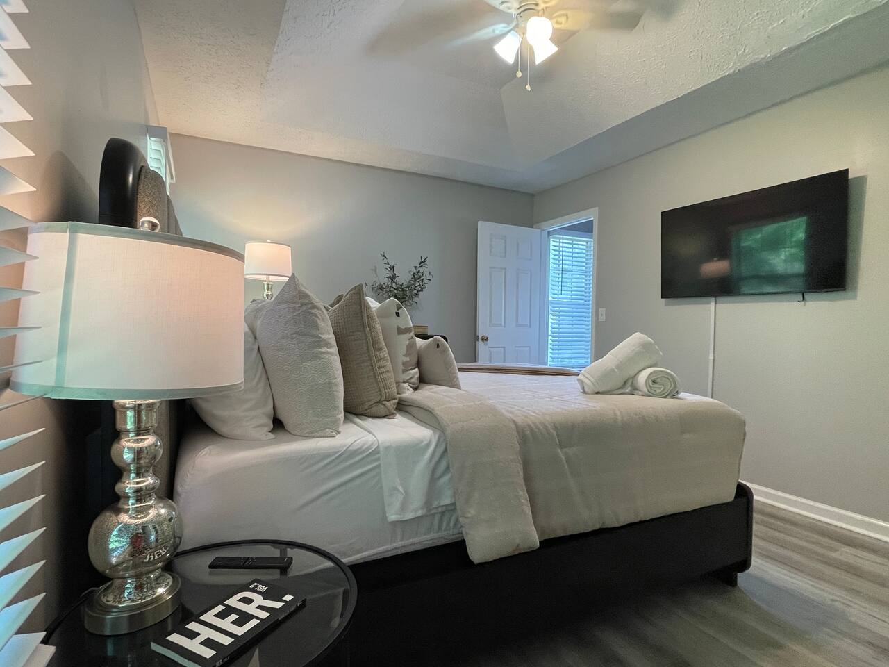 - Spacious & Modern Design – Thoughtfully furnished with a sleek, open-concept layout, high ceilings, and abundant natural light. - Comfortable Bedrooms – Well-appointed rooms with ample storage and a relaxing atmosphere. - King Size Bed - Relax in a plush king-sized bed with layers of soft pillows and a cozy blanket. The master bedroom features a chic, upholstered headboard and neutral decor for a boutique hotel feel. - Queen Size Bed - End your day in this comfy will well-styled bed with plenty of dresser space for a longer-term stay. - Fully Equipped Kitchen – Black appliances, modern cabinetry, and all essentials for home-cooked meals. - Cozy Living Area – Smart TVs (living room and all bedrooms), high-speed WiFi, and comfortable seating for relaxation. - Convenient Parking – Private parking for guests for 2 cars. Prime Location This property is in a prime location to be able to access all that Atlanta has to offer in a mature but quiet neighborhood. Gateway Center Campus Just a short drive away, this hub includes the Georgia International Convention Center (GICC), Gateway Center Arena, and several hotels and dining options. The ATL SkyTrain offers a complimentary 2-minute ride connecting the campus to Hartsfield-Jackson Atlanta International Airport. Gateway Center Arena Home to the College Park Skyhawks (NBA G League) and the Atlanta Dream (WNBA), this 100,000-square-foot arena hosts various sporting events and concerts. Historic College Park Golf Course Established in 1929, this nine-hole course offers a charming golfing experience amidst mature trees and well-maintained greens. Wikipedia Local Parks and Recreation Enjoy outdoor activities at nearby parks such as Barrett Park, Brenningham Park, Jamestown Park, and Richard D. Zupp Park. Recreation centers like the Wayman & Bessie Brady Recreation Center and the Hugh C. Conley Recreation Center offer various programs and facilities. Explore Georgia Proximity to Downtown Atlanta Downtown Atlanta is easily accessible, offering attractions like the Mercedes-Benz Stadium, Georgia Aquarium, World of Coca-Cola, and Centennial Olympic Park.